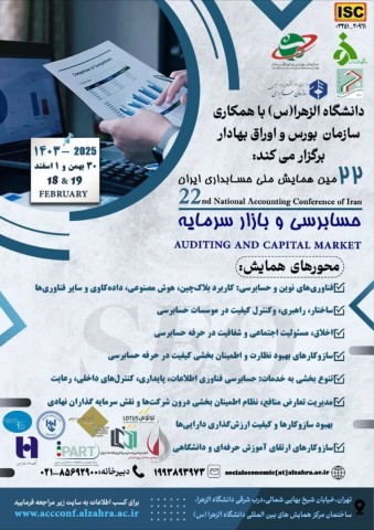 بیست و دومین همایش ملی حسابداری ایران (محور همایش: حسابرسی در بازار سرمایه) با همکاری سازمان بورس و اوراق بهادار تهران و انجمن حسابرسی فناوری اطلاعات و مرکز آموزش و تحقیقات حسابداران رسمی در تاریخهای 30 بهمن و 1 اسفند 1403 در مرکز همایشهای بینالمللی دانشگاه الزهرا به صورت حضوری با اعطای گواهینامه معتبر و امتیاز 5 ساعت آموزشی مورد قبول جامعه حسابداران رسمی ایران برگزار میشود.