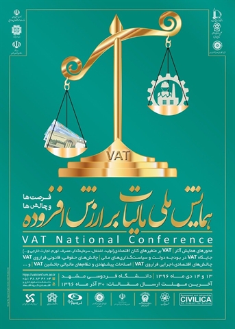 همایش ملی مالیات بر ارزش افزوده: فرصت ها و چالش ها در تاریخ ۱۳ دی ۱۳۹۶ تا ۱۴ دی ۱۳۹۶ توسط دانشگاه فردوسی مشهد و تحت حمایت سیویلیکا در شهر مشهد برگزار خواهد شد. با توجه به اینکه این همایش به صورت رسمی برگزار می گردد، کلیه مقالات این کنفرانس در پایگاه سیویلیکا و نیز کنسرسیوم محتوای ملی نمایه خواهد شد و شما می توانید با اطمینان کامل، مقالات خود را در این همایش ارائه نموده و از امتیازات علمی ارائه مقاله کنفرانس با دریافت گواهی کنفرانس استفاده نمایید.