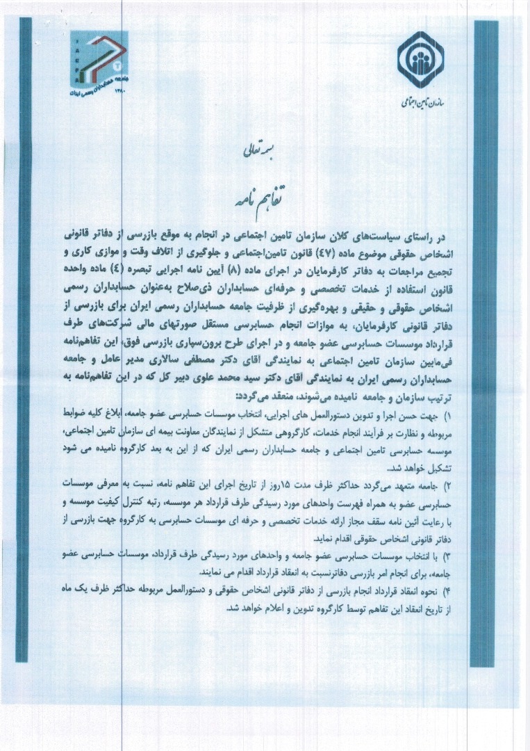🔸به‌موجب این تفاهم‌نامه بازرسی قانونی دفاتر کارفرمایان حقوقی موضوع ماده 47 قانون تأمین اجتماعی به‌موازات انجام حسابرسی مستقل صورت‌های مالی شرکت‌های طرف قرارداد، توسط مؤسسات حسابرسی عضو جامعه‌ی حسابداران رسمی ایران انجام خواهد شد.