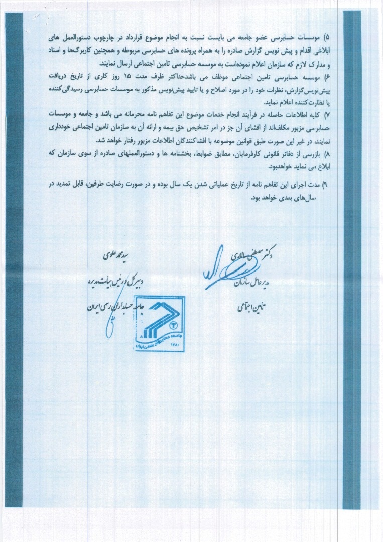 🔸 برای مطالعه‌ی متن کامل تفاهم‌نامه به تصویر تفاهم‌نامه در دو فایل پیوست مراجعه فرمایید. در عین حال، جزئیات مربوط به این تفاهم‌نامه به منظور ارائه‌ی فهرست مؤسسات حسابرسی عضو جامعه به سازمان تأمین اجتماعی متعاقباً به مؤسسات ابلاغ خواهد شد.