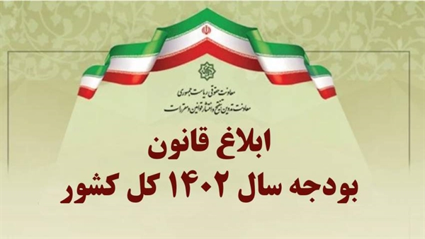 مطابق اصل یکصد و بیست و سوم (123) قانون اساسی جمهوری اسلامی ایران "قانون بودجه سال 1402 کل کشور" مصوب جلسه علنی روز چهارشنبه مورخ 1401/12/24 که از سوی مجمع محترم تشخیص مصلحت نظام در اجرای اصل یکصد و دوازدهم (112) قانون اساسی جمهوری اسلامی ایران و ماده (200) قانون آیین نامه داخلی مجلس شورای اسلامی موافق با مصلحت نظام تشخیص داده شده بود، در فایل پیوست ابلاغ شد.