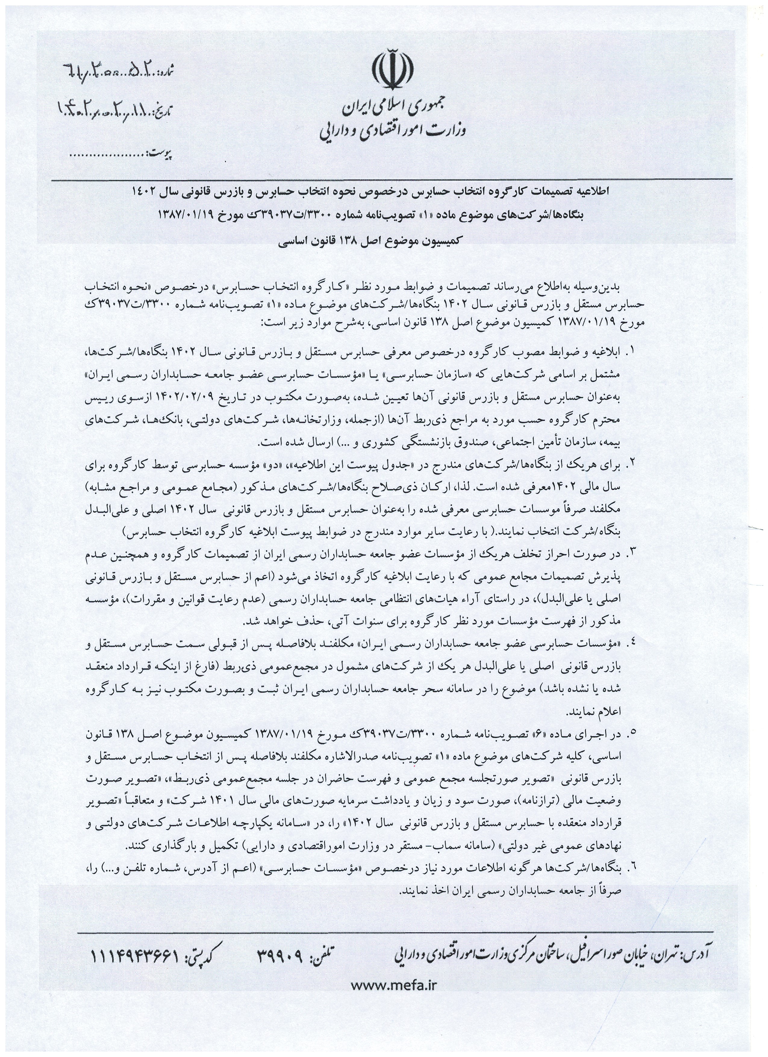بدینوسیله تصمیمات و ضوابط کارگروه انتخاب حسابرس و بازرس قانونی سال 1402 جهت استحضار ایفاد میگردد.