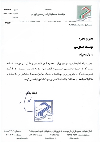 بدینویسیله اصلاحات پیشنهادی وزارت محترم امور اقتصادی و دارایی در مورد اساسنامه جامعه به همراه سوابق در فایل پیوست جهت اطلاع ایفاد می گردد.