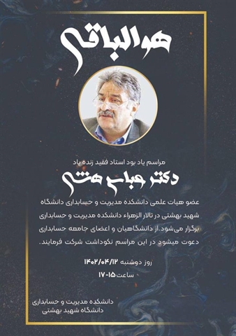 مراسم یاد بود استاد فقید زنده یاد دکتر عباس هشی روز دوشنبه 1402/04/12 ساعت 15 الی 17 در تالار الزهراء دانشکده مدیریت و حسابداری دانشگاه شهید بهشتی برگزار می شود.