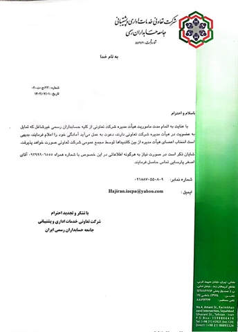 با عنایت به اتمام مدت ماموریت هیأت مدیره شرکت تعاونی از کلیه حسابداران رسمی غیرشاغل که تمایل به عضویت در هیأت مدیره شرکت تعاونی دارند، دعوت به عمل میآید آمادگی خود را از طریق شماره فکس 9-88705508 اعلام فرمایند، بدیهی است انتخاب اعضای هیأت مدیره از بین کاندیداها توسط مجمع عمومی شرکت تعاونی صورت خواهد پذیرفت.