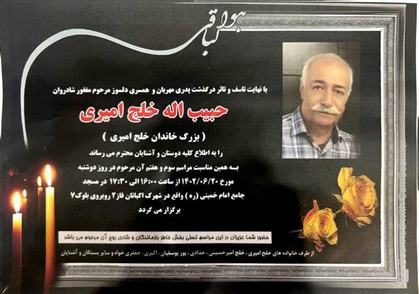 به همین مناسبت مراسم سوم و هفتم آن مرحوم در روز دوشنبه مورخ 1402/06/20 از ساعت 16:00 الی 17:30 در مسجد جامع امام خمینی (ره) واقع در شهرک اکباتان فاز 2 روبروی بلوک 7 برگزار می گردد.