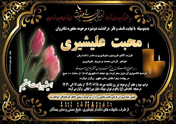 ضمنا مراسم سوم و هفتم آن مرحومه نیز روز یکشنبه مورخ 1403/06/18 از ساعت 16 الی 17:30 در مسجد امام علی (ع) واقع در تهران، پونک، بلوار میرزابابایی برگزار می گردد.